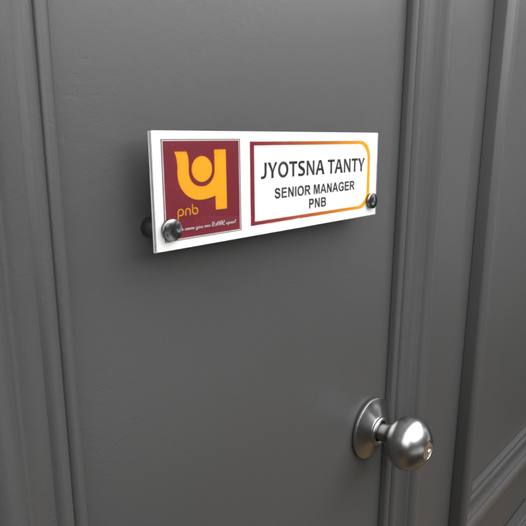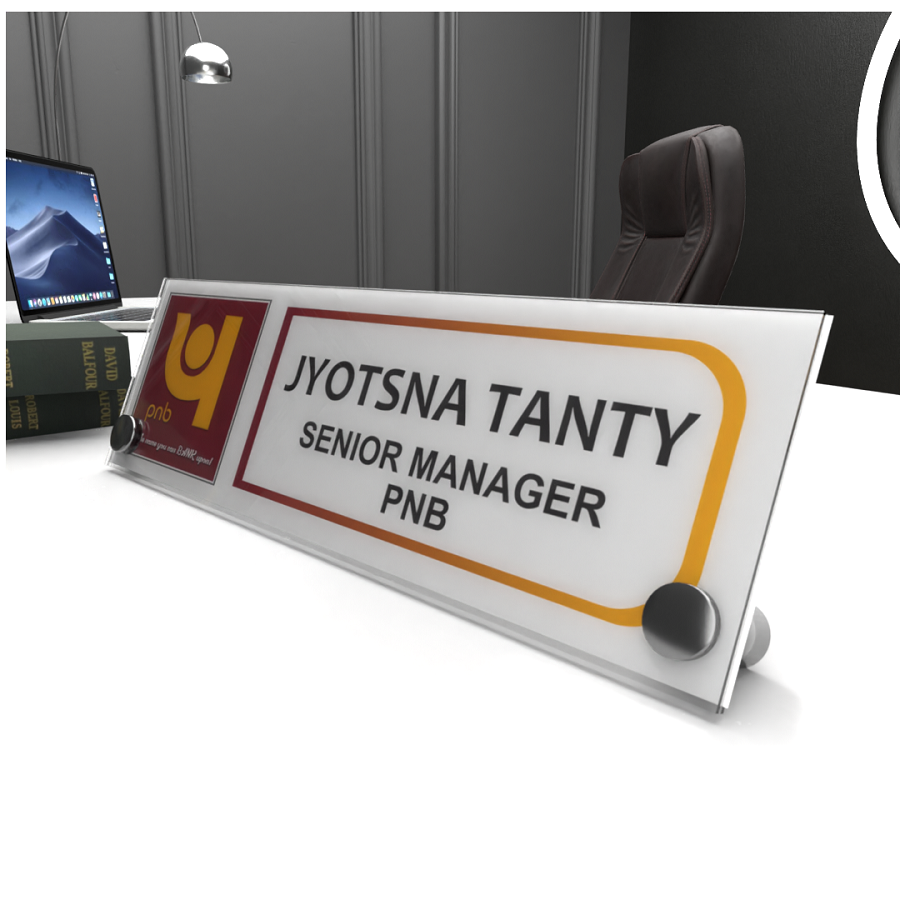 Acrylic Desk/Door Name Plate dimensions: 9 Inch Long X 3 Inch Tall And middle of the two acrylic there will be Color paper print