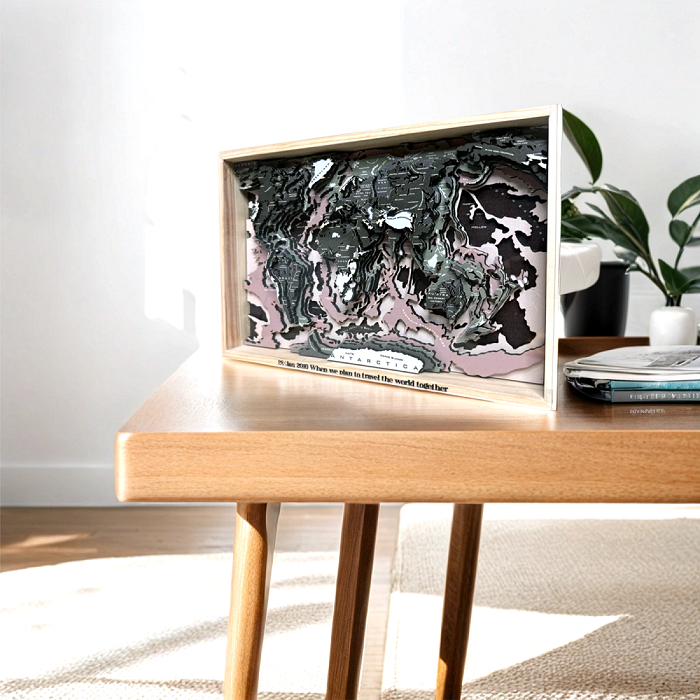 Depth and Dimension: With seven layers of wood meticulously stacked, our 3D map creates depth and dimension, bringing the world to life right on your desk.