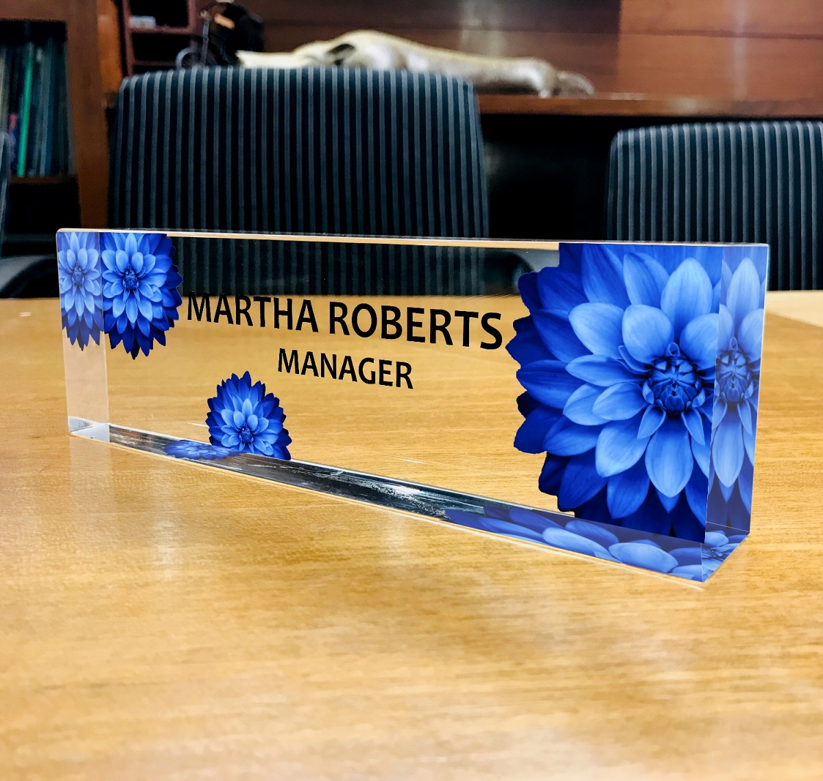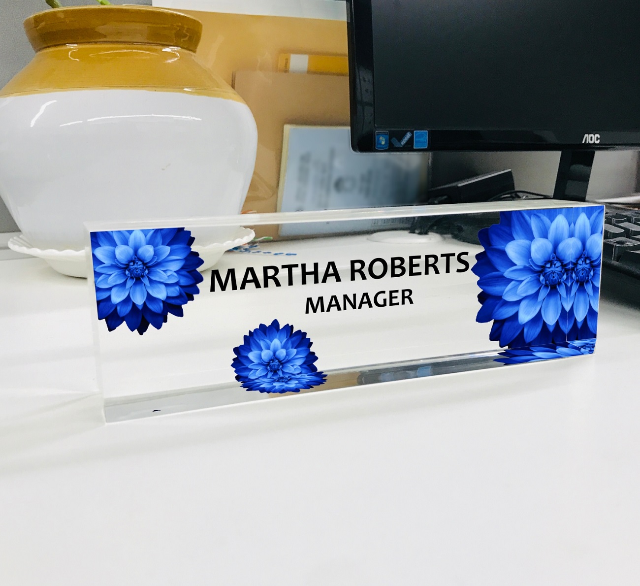 Premium Customize Acrylic Desk Name Plate Blue Flower
